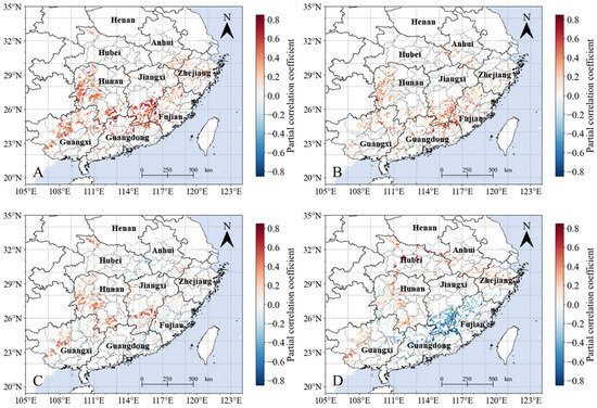 Partial correlation coefficient of annual NPP with mean daily temperature (A), daily maximum temperature (B), daily minimum temperature (C), and precipitation (D) in the southern hilly region of China from 2001–2021.