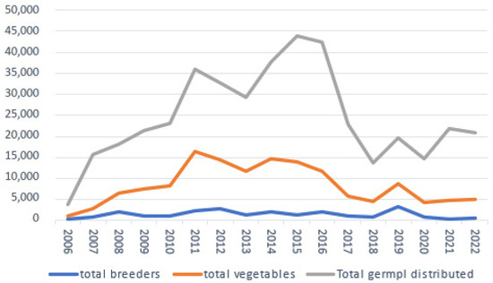 Figure 3. Numbers of distributed samples of vegetable crops by IPK to plant breeders only (blue line), to all users (orange), and total samples of all conserved crops and species distributed per year (light blue), from 2006–2022.