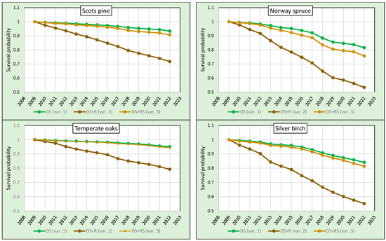 The lowest probability of survival between 2009 and 2022 was found for spruce—the survival rates for all variants were the lowest among the tree species analysed. In variant 1, it reached 81.6%, in variant 2 it was 53.3% and in variant 3, in which mortality was calculated taking into account the dead trees remaining on the plots and the trees removed in sanitary cuttings, it was 75.7%. The survival rates of birch were similar to those of spruce (84.1%, 55.2% and 81.4%, respectively), while those of pine were significantly higher (93.3%, 71.7% and 90.7%, respectively). The lowest mortality rates and the highest survival in the period 2009–2022 were found for temperate oaks. For variant 1, it was 95.1%, 79.2% for variant 2 and 94.3% for variant 3. The analysed tree species can thus be ranked according to decreasing survival probability in the period 2009–2022 in the following order: temperate oaks, pine, birch and spruce.