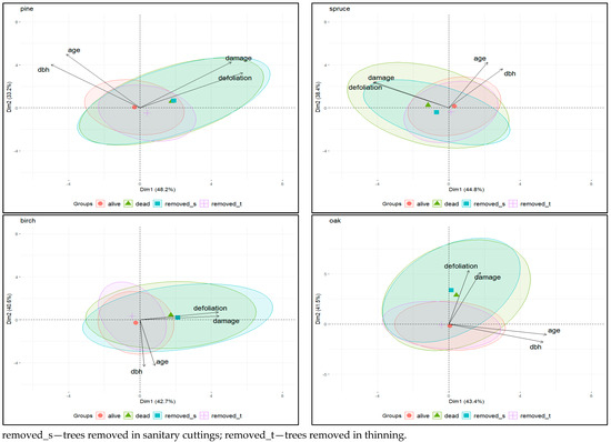 Group-specific concentration ellipses help to recognise similarities and differences in the relationships between the traits in the distinguished categories of trees. Different behaviour of PCA concentration ellipsoids was observed among tree categories. The concentration ellipsoids for dead trees and trees removed due to sanitary cuttings on the one hand and for living trees and trees removed due to thinning on the other hand overlapped, indicating that the variables in these groups have similar patterns of variation and correlations (Figure 2). Regardless of tree species, dead trees and trees removed due to sanitary cuttings had higher mean values for defoliation and damage than living trees and trees removed due to thinning.