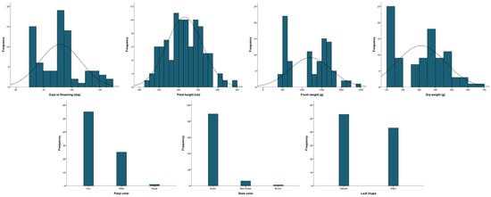 The 96 kenaf lines were determined for four quantitative traits: days to flowering, plant height, fresh weight, and dry weight, and three qualitative traits: flower color, stem color, and leaf shape (Table 1 and Figure 1). The days to flowering ranged from 72 to 125 d (mean 92 d) and plant height was 223–444 cm (mean 315 cm). The fresh and dry weights were 472–2400 g and 110–672 g, respectively (mean 1209 and 312 g). The coefficients of variation for days to flowering and plant height were 16.1% and 14.6%, respectively, which were significantly lower than for fresh and dry weight (43.4% and 47.9%). The skewness of all four traits was close to zero, and the height of the distribution was lower than the normal distribution. Ivory was the most common flower color (55 lines), followed by white (25) and purple (1). The most common stem color was green (89 lines), followed by dark purple (6) and brown (1). For leaf shape, there were 53 palmate types and 43 entire types. The correlations between the seven agricultural traits are shown in Table 2. The four agronomic traits, days to flowering, plant height, fresh weight, and dry weight, each had a positive correlation (p ≤ 0.01). In contrast, stem color showed a negative correlation with fresh and dry weight (p ≤ 0.05).