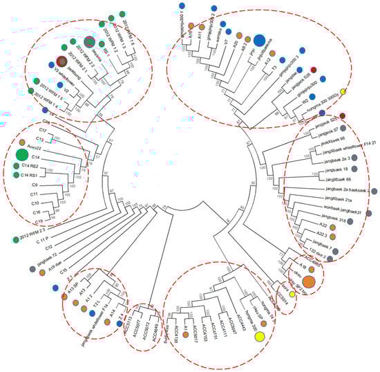 Phylogenetic tree constructed using 49,241 filtered SNP loci from 96 kenaf genotypes. Colored circles represent mutant lines; the larger colored circles denote the respective original genotypes.