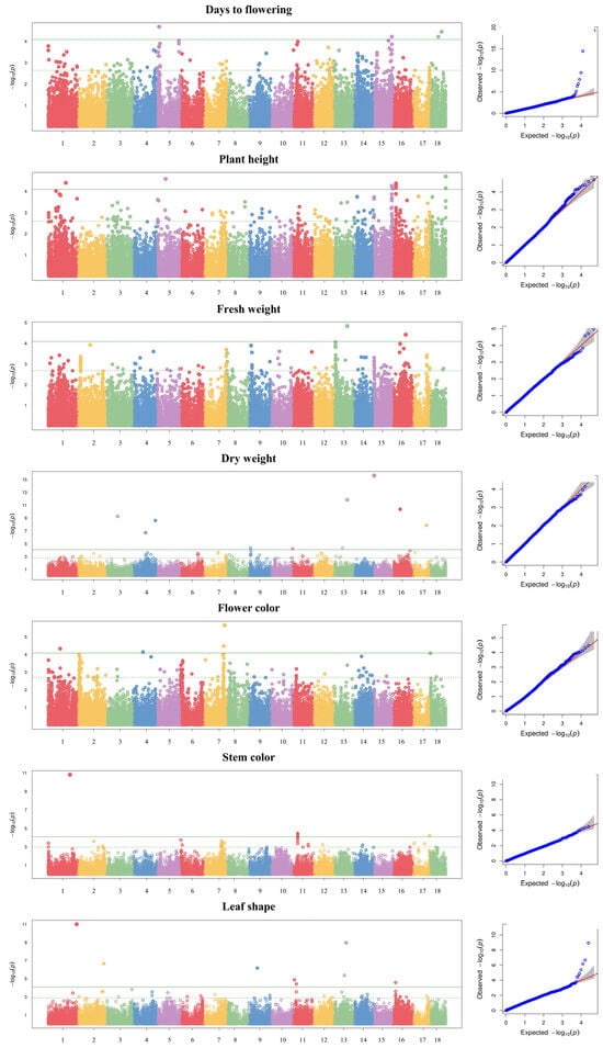 Manhattan plots and quantile–quantile plots for seven agronomic traits in 96 kenaf genotypes.