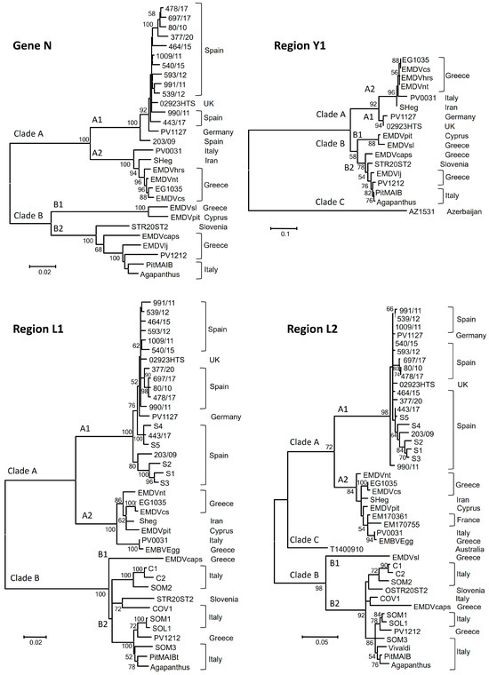 Phylogenetic analyses of genomic regions N, Y1, L1 and L2 were congruent among themselves and with those from previous studies [11,12,21]. These phylogenetic trees show a certain geographic structure since the Australian isolate is in clade C, all Spanish isolates are in subclade A1 and most Italian isolates are in subclade B2. However, Greece contains EMDV isolates in clades A (subclade 2) and B (B1 and B2), and France contains isolates in subclade A2, which are more similar to distant isolates like SH-eg from Iran than isolates located in Spain, Germany and the UK. More isolates from different countries should be analyzed to gain insight into the migration routes of EMDV [27].