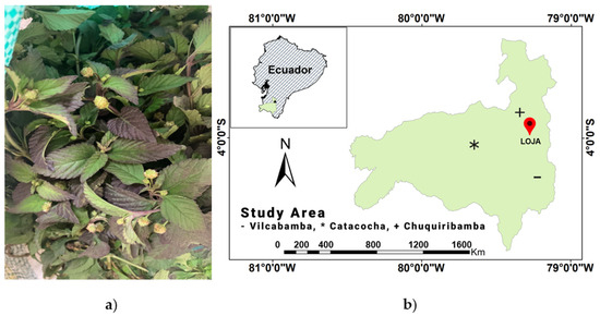 The chemical composition of the volatile oil from L. dulcis Trevir. grown in Ecuador (Figure 2a) has not been investigated so far. In this inaugural study that we intend to extend to the entire country, we describe the components of the oil steam distilled from the leaves and flowers of L. dulcis grown in the Loja province in southern Ecuador. To investigate the variability of the oil composition, three samples were obtained at three different locations near the town of Loja: the Catacocha canton (Ca), the Vilcabamba parish (Vi), and the Chuquiribamba parish (Ch) (Figure 2b). In the folk medicine of local communities, infusions of the flowers and roots of L. dulcis are widely used for stopping menstrual bleeding and treating stomach inflammation [12].