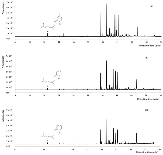 Gas chromatograms of L. dulcis. EOs from (A) Catacocha, (B) Vilcabamba, and (C) Chuquiribamba, on a DB-5ms column, thermal dissociation products of hernandulcin: a) 6-methyl-5-hepten-2-one, b) 3-methyl-2-cyclohexen-1-one.