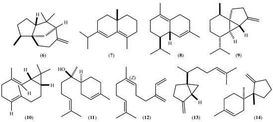 The components occurring in the three EOs with percentages >3% on the DB-5ms column are listed in Table 3, while their chemical structures are depicted in Figure 3. Only the relative stereochemistry is shown.