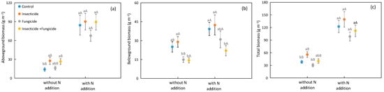 Difference in plant (a) aboveground, (b) belowground, (c) total biomass among heterotroph removal with or without N addition. Significant differences between systems without or with nitrogen addition were indicated in capital letters, and significant differences among heterotroph removal were indicated in lowercase letters. Each circle represents the average biomass of all species compositions under each heterotroph removal treatment. Blue: control; orange: insecticide; gray: fungicide; yellow: all removal.