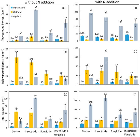 Difference in monoculture plant aboveground biomass (a), belowground biomass (c), and total biomass (e) in systems without N addition and plant aboveground biomass (b), belowground biomass (d), and total biomass (f) in systems with N addition among heterotroph exclusion with or without N addition. Significant differences between heterotroph removal groups were indicated in capital letters, and significant differences between plant species monocultures were indicated in lowercase letters. Blue bars: P. frutescens monoculture; yellow bars: B. striata monoculture; gray bars: B. pilosa monoculture.