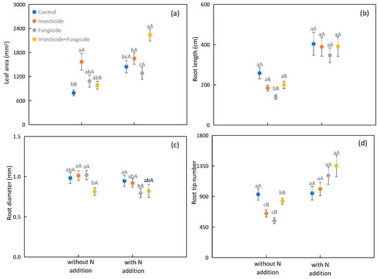 Difference in plant functional traits of plant leaf area (a), root length (b), root diameter (c), and root tip number (d) among heterotroph removal with or without N addition. Significant differences between systems without or with nitrogen addition were indicated in capital letters, and significant differences between heterotroph removals were indicated in lowercase letters. Each circle represents the average plant functional traits of all species compositions. Blue: control; orange: insecticide; gray: fungicide; yellow: insecticide and fungicide.