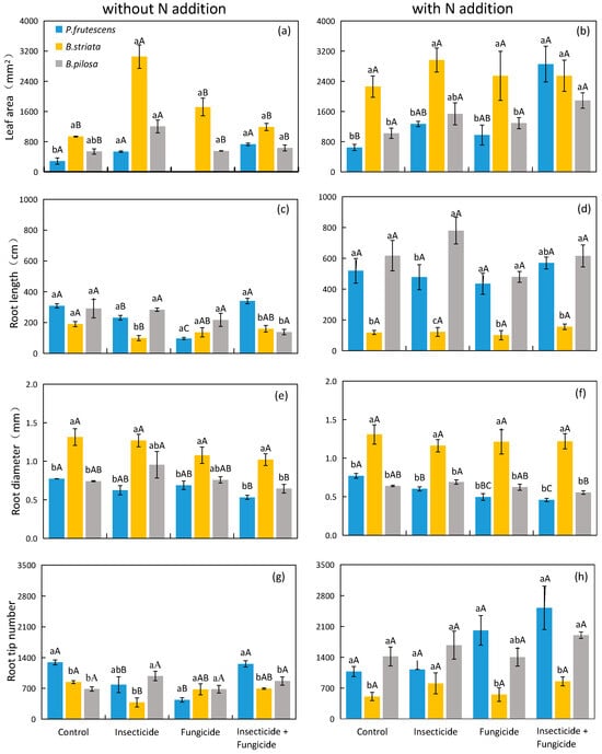 Difference in monoculture plant leaf area (a), root length (c), root diameter (e), root tip number (g) in systems without N addition and leaf area (b), root length (d), root diameter (f), root tip number (h) in systems with N addition among heterotroph exclusion with or without N addition. Significant differences between heterotroph removals were indicated in capital letters, and significant differences between plant species monocultures were indicated in lowercase letters. Blue bars: P. frutescens monoculture; yellow bars: B. striata monoculture; gray bars: B. pilosa monoculture.