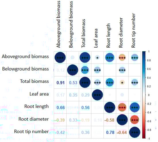Species richness significantly affected the plant leaf area and root tip number but did not affect the root length and diameter (Table S1). The plant leaf area decreased when the species richness increased to two and three, while the root tip number increased when species richness increased to three. Plant species compositions also significantly affected the plant leaf area, root length, root diameter, and root tip number (Table S1).