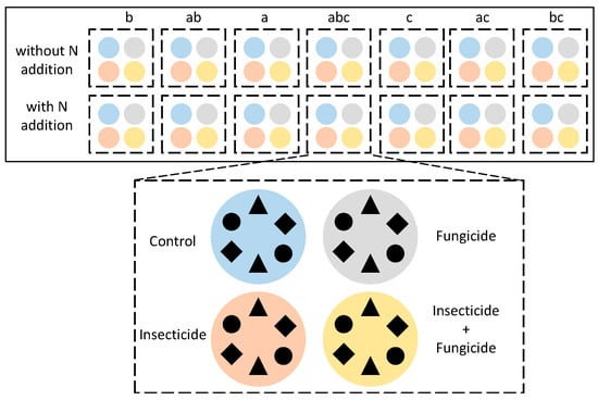 Experimental design (one block). The letters above the uppermost boxes represent plant species compositions, and species compositions within each group are randomly arranged. Colors represent heterotroph removal treatments: blue: control; orange: insecticide; gray: fungicide; yellow: insecticide and fungicide. The three-species treatment is depicted here, with different shapes representing different species. Six plants are planted in each experimental system uniformly.