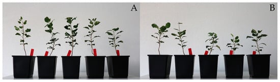 Samples of the control (A) and salt-treated (B) two-year-old seedlings of P. pyraster at the end of the experiment.