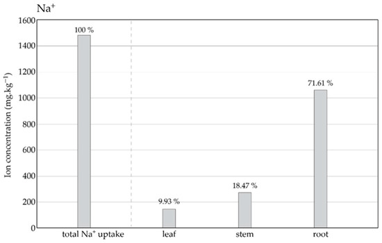 The content and distribution of Na+ ions in the plant tissues (leaves, stems, roots) of P. pyraster grown for 60 days under salt treatment with 100 mM NaCl solution. The values above the bars indicate distribution to the plant organs as a percentage of the total Na+ ion uptake.