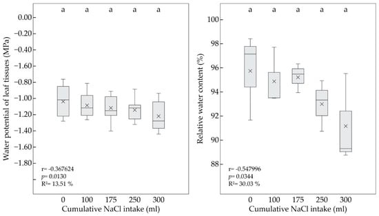 The water potential of leaf tissue (Ψwl) (left) and relative water content (RWC) (right) of P. pyraster seedlings measured at the beginning of the experiment (0 mL) and during the salt treatment with 100 mM NaCl solution. A multiple comparison of the means (n = 9) was performed using the Tukey honest significant difference (HSD) test. The same letters indicate insignificant differences between measurements. The solid line indicates the median, the multiple symbol (×) shows the mean. The relationship between the plant parameters and the increasing volume of NaCl intake was analyzed by simple regression.