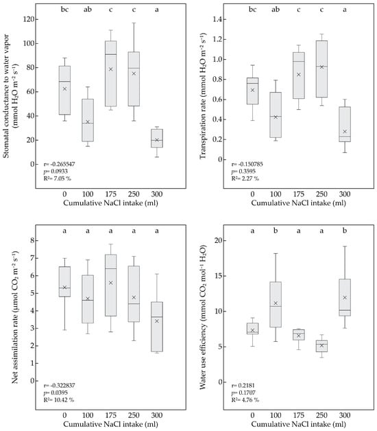 Box plot for the leaf gas exchange parameters (gs, E, An, WUE) for seedlings of P. pyraster at the beginning of experiment (0 mL) and during the salt treatment with 100 mM NaCl solution. A multiple comparison of the means (n = 7) was performed using the Tukey honest significant difference (HSD) test. The different letters indicate significant differences between measurements. The solid line indicates the median, the multiple symbol (×) shows the mean. The relationship between the plant parameters and the increasing volume of NaCl intake was analyzed by simple regression.