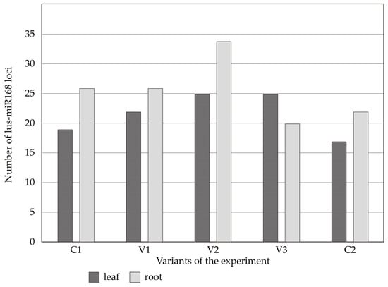 MiRNA loci detected by lus-miR168-based primers in leaf and root samples of the control (C1 and C2) and treatment (V1, V2 and V3) variants. C1—1st day of the experiment, without treatment; C2—60th day of the experiment, without treatment; V1—20th day of the experiment, 100 mL of 100 mM NaCl; V2—35th day of the experiment, 175 mL of 100 mM NaCl; V3—60th day of the experiment, 300 mL of 100mM NaCl.