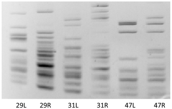 MiRNA-based stress-induced cDNA polymorphism detected by lus-miR168 primers. Representative figure of three biological replicates treated with 100 mM NaCl on 35th day of experiment. L—leaf sample, R—root sample. The numbers 29, 31, and 47 represent the three genotypes (biological replicates) of salt-treated seedlings.