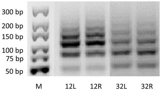 The amplification result was checked on 3% agarose gels stained with GelRed® nucleic acid in 10,000× in water (Biotium, San Francisco, CA, USA), running in 1 × TBE buffer at 100 V, 30 mA for 60 min. The ready-to-use GeneRuler Ultra Low Range DNA Ladder, Thermo Scientific™ (Waltham, MA, USA), was used. The samples with primers in which the polymorphism was recorded were separated on 15% PAGE gels (TBE-Urea Gels, Invitrogen, Waltham, MA, USA) and subsequently stained in a 1 × TBE solution containing GelRed® nucleic acid for PAGE in 10,000× in water (Biotium). The gels were visualized on the G-Box Syngene electrophoresis documentation system and analyzed using GeneTools software version 4.3.10.0 (Syngene, Bengaluru, India).