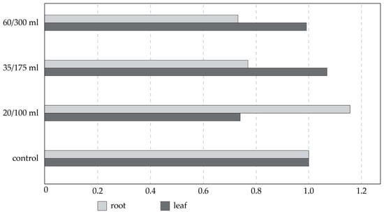 In PBA expression, the obtained Cts in the analyzed leaf samples ranged from 29.21 to the 34.22 for actin, with standard deviations as follows: 20/100 mL 0.68; 35/175 mL 1.04; 60/300 mL 0.83. The obtained Cts in the analyzed root samples ranged from 34.04 to 37.35, with standard deviations as follows: 20/100 mL 0.49; 35/175 mL 1.04; 60/300 mL 0.74. The obtained Cts in the analyzed samples ranged from 29.2 to 30.54 in the leaf samples for P450 with standard deviations as follows: 20/100 mL 0.2; 35/175 mL 0.03; 60/300 mL 0.34, and from 29.65 to 30.39 in the root samples, with standard deviations as follows: 20/100 mL 0.2; 35/175 mL 0.31; 60/300 mL 0.06.