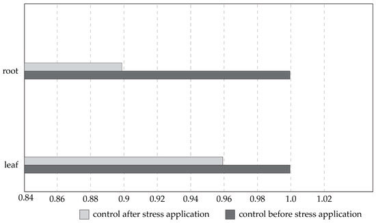A comparison of the P. pyraster cytochrome P450 expression levels of the control plants before and after the salt stress treatment was performed to obtain the data, and the expression of cytochrome P450 was stagnant or very similar over time without the stress factor of salt (Figure 9). For the roots, a 16% variance ranging between 0.9 and 1, and for the leaves, a 10% variance ranging between 0.96 and 1 were obtained, which shows stability in expression.