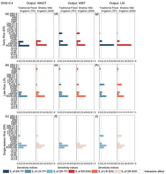 First-order sensitivity indices (Si) and interaction effects of the ORYZA-N model at DVS = 0.4: crop-related outputs WAGT (a–c), WST (d–f), and LAI (g–i) for early rice, late rice, and single-season rice under traditional flood irrigation and shallow–wet irrigation conditions.
