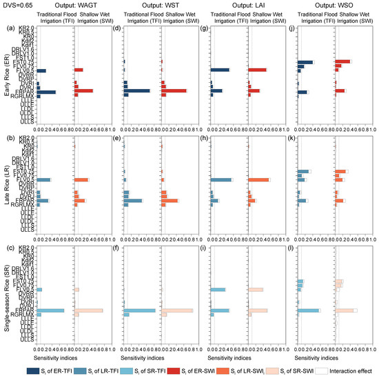 First-order sensitivity indices (Si) and interaction effects of the ORYZA-N model at DVS = 0.65: crop-related outputs WAGT (a–c), WST (d–f), LAI (g–i), and WSO (j–l) for early rice, late rice, and single-season rice under traditional flood irrigation and shallow–wet irrigation conditions.