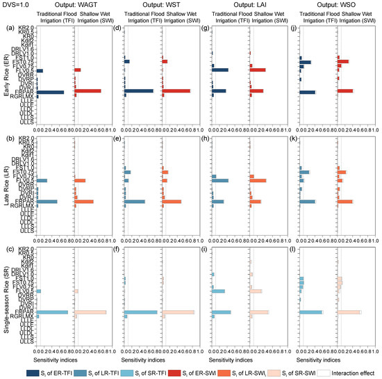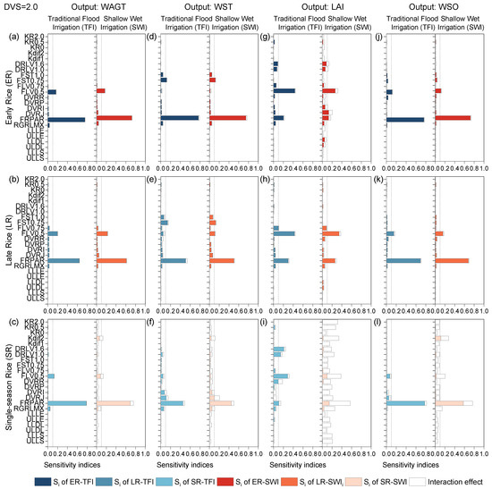 First-order sensitivity indices (Si) and interaction effects of the ORYZA-N model at DVS = 2.0: crop-related outputs WAGT (a–c), WST (d–f), LAI (g–i), and WSO (j–l) for early rice, late rice, and single-season rice under traditional flood irrigation and shallow–wet irrigation conditions.