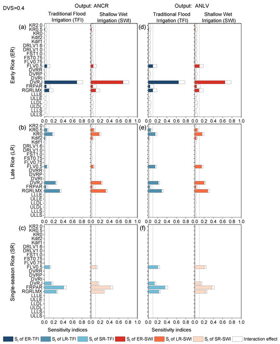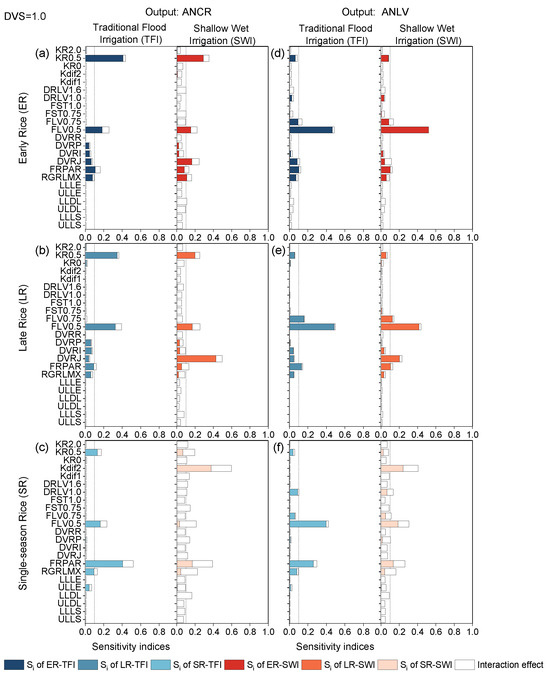 First-order sensitivity indices (Si) and interaction effects of the ORYZA-N model at DVS = 0.4: nitrogen-related outputs ANCR (a–c) and ANLV (d–f) for early rice, late rice, and single-season rice under traditional flood irrigation and shallow–wet irrigation conditions.