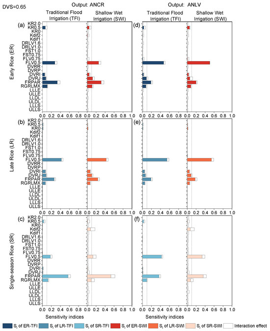First-order sensitivity indices (Si) and interaction effects of the ORYZA-N model at DVS = 0.65: nitrogen-related outputs ANCR (a–c) and ANLV (d–f) for early rice, late rice, and single-season rice under traditional flood irrigation and shallow–wet irrigation conditions.