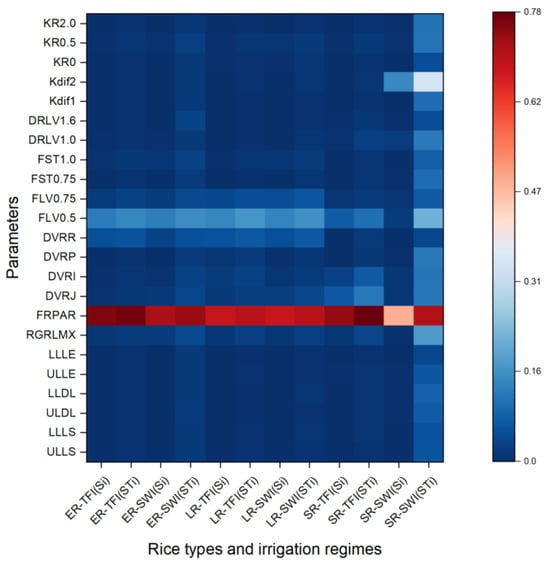 For WRR14, FRPAR was the most important parameter, followed by FLV0.5, FLV0.75, and DVRR. For both TFI and SWI of double-season rice, the effects of all other parameters were negligible. As for single-season rice, the sensitivity of parameters under TFI was consistent with that of double-season rice, and the effect of Kdif2 on the sensitivity results was not ignorable in SWI. The developmental rate of each stage (DVRJ, DVRI, DVRP, DVRR) had a varying impact on dry biomass and nitrogen content of each organ, which also indirectly influenced the yield formation. This was consistent with the results of Yu et al. (2023) [31] and Xu et al. (2018) [38]. Since the ponded water layer of single-season rice in cold regions has the role of maintaining soil temperature in the root zone and sustaining crop growth during the growing season, controlled irrigation regimes would affect the growth and yield formation of single-season rice in cold regions at some degree, and the interaction effect among the parameters was higher than other scenarios [11,39].