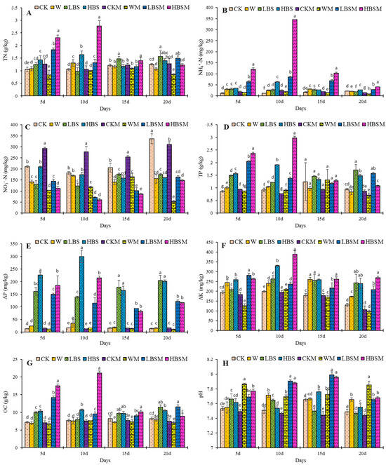 Changing trend of soil properties following biogas slurry pretreatment. (A): TN (total nitrogen); (B): NH4+-N (ammonium nitrogen); (C): NO3–-N (nitrate nitrogen); (D): TP (total phosphorus); (E): AP (available phosphorus); (F): AK (available potassium); (G): OC (organic carbon); (H): pH. The lowercase letters a, b, c, d, e, f, g and h in the figure show observable significant differences (p < 0.05).