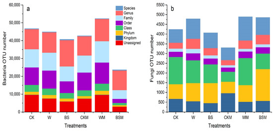 OTU cluster analysis and annotation results of soil bacteria and fungi in pretreated soil. (a): bacteria OUT number; (b): fungi OUT number.