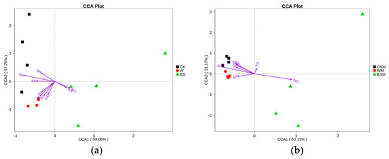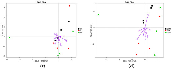 The CCA analysis shows that the content of NH4+-N in soil was the main contributory factor to the observed inhibition of the growth of bacteria without mulching (Figure 4a,b), while the soil pH was mainly responsible for the inhibition of the growth of bacteria and fungi in soil with mulching (Figure 4c,d). In addition, soil NO3−-N was positively correlated with the proliferation of bacteria and fungi, and soil OC was positively correlated with the proliferation of fungi, but negatively correlated with the reproduction of bacteria.