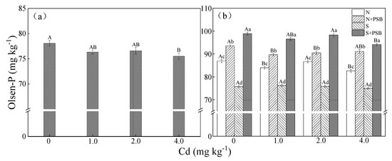 The content of Olsen-P in the soil of different treatment groups at 0 d (a) and 28 d (b). Note: error bars indicate standard error of the means (n = 3), different capital letters indicate significant differences between different Cd concentration at the same treatment (p < 0.05), and different lower-case letters indicate significant differences between different treatments at the same Cd concentration (p < 0.05).