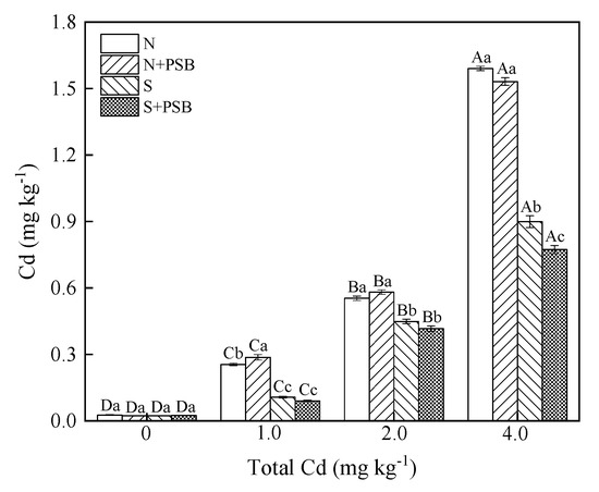 The content of available Cd in the soil in different treatment groups. Note: Error bars indicate standard error of the means (n = 3). Different capital letters indicate significant differences between different Cd concentrations at the same treatment (p < 0.05), and different lowercase letters indicate significant differences between different treatments at the same Cd concentration (p < 0.05).