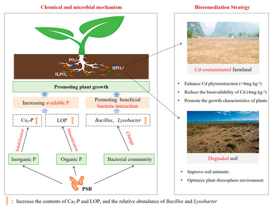 - Yang, P.; Zhou, X.; Wang, L.; Li, Q.S.; Zhou, T.; Chen, Y.K.; Zhao, Z.Y.; He, B.Y. Effect of Phosphate-Solubilizing Bacteria on the Mobility of Insoluble Cadmium and Metabolic Analysis. Int. J. Environ. Res. Public Health 2018, 15, 1330. [Google Scholar] [CrossRef]