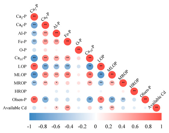 Correlation analysis of inorganic P, organic P forms, and available Cd of Cd-contaminated soil (28 d) after the application of Priestia aryabhattai. Note: red and blue circles indicate positive and negative correlation, respectively. Circles, from big to small indicate, indicate the decreased correlation from high to low. “*” sign in the circle indicates a significant difference between indicators (p < 0.05); “**” indicates a significant difference (p < 0.01) (Pearson correlation analysis).