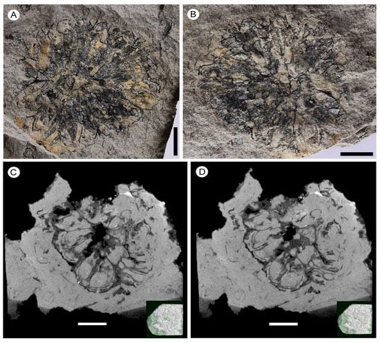 Capitate infructescences of Liquidambar nanningensis, holotype. (A,B) Subcircular infructescence; note the absence of persistent style bases, NNEZ-15a and NNEZ-15b, respectively. (C,D) Micro-CT images showing bilocular fruits, free distally and fused basally, NNEZ-15b. Scale bar: 5 mm.