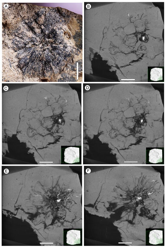 Capitate infructescences of Liquidambar nanningensis, NNEZ-21b. (A) Rounded infructescence. (B–F) A series of consecutive micro-CT images. Scale bar: 5 mm.