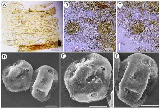 Remarks. Pollen grains of Liquidambar were observed on the surface of Liquidambar nanningensis carpels (Figure 4B,C). Additionally, dispersed pollen grains of the same type were found in association with the infructescences (Figure 4D–F and Figure 5A–F). The fruiting body of an endophytic micromycete (Figure 6D) and fungal spores (Figure 6A–C) occur on the L. nanningensis carpel surface.