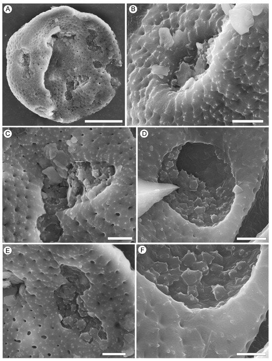 Morphology of the pollen grains of Liquidambar sp. 1, NNEZ-42, SEM. (A) Circular pantoporate pollen grain. (B–D) Round to slightly elliptic pores. (E,F) Details of the foveolate exine and pore membrane. Scale bar: 10 µm (A), 2 µm (B–E), and 1 µm (F).