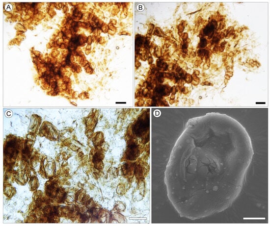 - Hofmann, C.C.; Spicer, R.A.; Ahlberg, A.; Herman, A.B. Scanning electron microscopy investigation of monads and tetrads of basal core eudicots from the Upper Cretaceous Vilui Basin, Siberia: Evidence for reticulate evolution. Rev. Palaeobot. Palynol. 2011, 167, 196–211. [Google Scholar] [CrossRef]