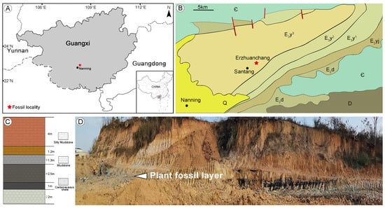 Location and stratigraphy of the fossil site in Guangxi, South China. (A) Geographic maps showing the location of the Nanning Basin. (B) Geological map of the Nanning Basin, modified from Zhao (1981) and Quan et al. (2016) [70,74]. Ꞓ—Cambrian, D—Devonian, E2d—Ducun Formation, E2yj—Yongjiang Formation, E3y1—lower part of the Yongning Formation, E3y2—middle part of the Yongning Formation, E3y3—upper part of the Yongning Formation, and Q—Quaternary. (C) Lithological column of the fossil site. (D) Outcrop of the Erzhuanchang locality. The arrow indicates the plant fossil layer.