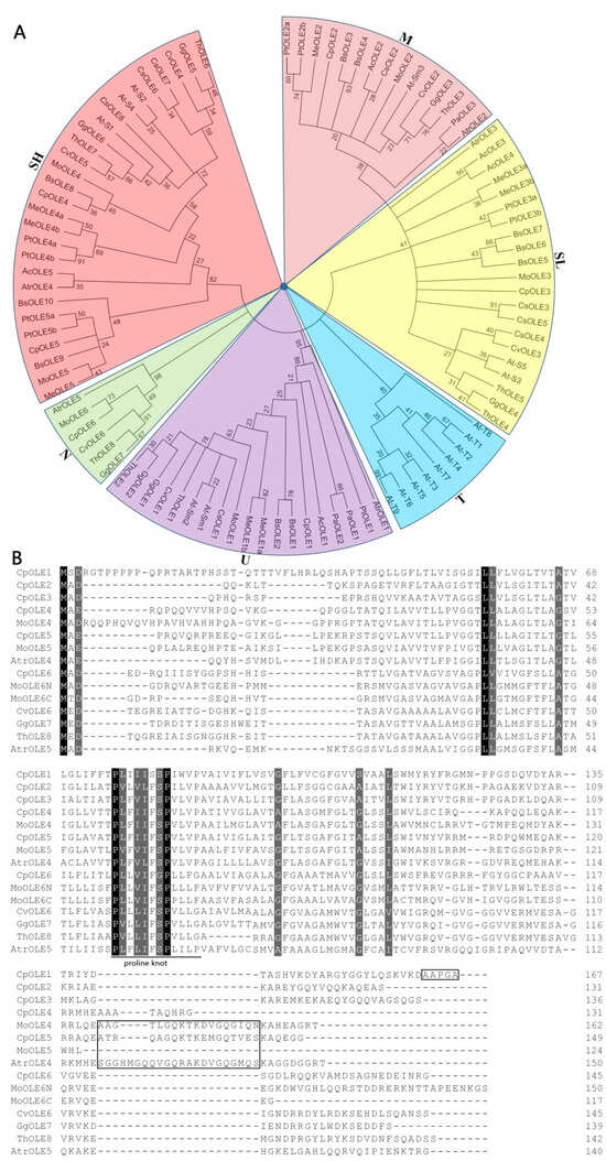 Oleosins are a class of highly abundant structural proteins of lipid droplets (LDs), which represent a major carbon reserve and are widely present in various plant organs such as seeds, pollen, flowers, fruits, and certain tubers [1,2,3,4,5]. Oleosins are typical for their small molecular weight (MW) of 14–30 kDa [5,6,7,8,9,10,11,12,13]. Nevertheless, all of them share a conserved central hydrophobic portion of approximately 72 residues, which could form a hairpin penetrating the surface phospholipid monolayer of an LD into the matrix. The hydrophobic hairpin is composed of two arms (each of about 30 residues) connected by a 12-residue loop with the pattern of PX5SPX3P, where X represents a nonpolar residue. By contrast, N- and C-terminal peptides, which lie on the phospholipid surface and may act as a receptor for metabolic enzymes or regulatory proteins, are amphipathic and usually variable [8,14]. Genome-wide surveys reveal that oleosin genes have already appeared in the single-celled algae, e.g., Chlamydomonas reinhardtii, and have diverged into at least six clades known as P (primitive), U (universal), SL (seed low), SH (seed high), T (tapetum), and M (mesocarp) during later evolution [4,8,15]. The most primitive Clade P was only found in green algae, mosses, and ferns, whereas Clade U, which is typical for the C-terminal AAPGA, is universally present in all land plants including Selaginella moellendorffii. Clade SL, which is present in seeds of both gymnosperms and angiosperms, was named after the low MW. This clade was proposed to first evolve from Clade U and later gave rise to Clades SH, M, and T. Clade SH, which is usually present in seeds of angiosperms, is typical for the high MW and C-terminal insertion relative to Clade SL. By contrast, Clades M and T were reported to be lineage-specific, which are confined to Lauraceae and Brassicaceae, respectively [4,8]. Comparative genomics analyses indicated that, for most clades, gene expansion was mainly contributed by whole-genome duplications (WGDs) especially those lineage-specific recent WGDs, e.g., the Brassicaceae-specific α WGD and the ρ WGD shared by cassava (Manihot esculenta) and rubber tree (Hevea brasiliensis) in Euphorbiaceae [5,6,12], in stark contrast to a key role of tandem duplication for Clade T in Brassicaceae [3,8,16].
