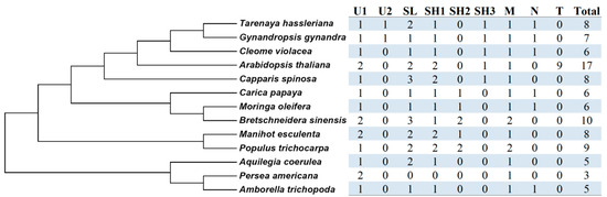 Brassicaceae belongs to the order Brassicales, which includes 17 families, 398 genera, and 4450 species that have experienced multiple independent WGDs [17]. Thus far, genome-wide identification of oleosin family genes has been reported in 10 species within Brassicales. However, most of them (80%) belong to the Brassicaceae family [3,8,10]. Although it was established that Clade T is absent from papaya (Carica papaya, Caricaceae) and spider flower (Tarenaya hassleriana, Cleomaceae) [8], whether it is present or has been lost in other families within Brassicales is yet to be addressed. Recently available or updated genome assemblies for species in five Brassicales families beyond Brassicaceae, i.e., papaya [18], horseradish (Moringa oleifera, Moringaceae) [19], Bretschneidera sinensis (Akaniaceae) [20], caperbush (Capparis spinosa, Capparaceae) [21], Cleome violacea (Cleomaceae), acaya (Gynandropsis gynandra, Cleomaceae) [22], and spider flower [23], provide a good chance to uncover lineage-specific evolution of the oleosin gene family in this important plant order.
