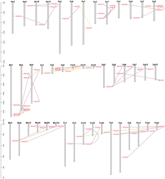 Chromosomal locations and duplication events of oleosin genes. Serial numbers are indicated at the top of each chromosome/scaffold, and the scale is in Mb. Duplicate pairs identified in this study are connected using lines in different colors, i.e., tandem (blue), transposed (green), dispersed (purple), and WGD (gold). (Ac: A. coerulea; Atr: A. trichopoda; Bs: B. sinensis; Chr: chromosome; Cp: C. papaya; Cs: C. spinosa; Cv: C. violacea; Gg: G. gynandra; Mo: M. oleifera; OLE: oleosin; Pa: P. americana; Scf: scaffold; Th: T. hassleriana).