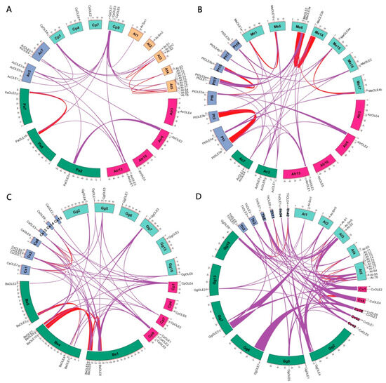 Synteny analyses within and between C. papaya and other species. (A) C. papaya, A. thaliana, A. coerulea, P. americana, and A. trichopoda. (B) P. trichocarpa, M. esculenta, A. coerulea, and A. trichopoda. (C) C. papaya, B. sinensis, C. spinosa; and G. gynandra. (D) C. violacea, G. gynandra, T. hassleriana, and A. thaliana. Syntenic blocks were inferred using MCScanX (E-value ≤ 1 × 10−10; BLAST hits ≥ 5). Oleosin-encoding chromosomes/scaffolds are shown, and only syntenic blocks that contain oleosin genes are marked in red (intra) and purple (inter), respectively. (Ac: A. coerulea; At: A. thaliana; Atr: A. trichopoda; Bs: B. sinensis; Chr: chromosome; Cp: C. papaya; Cs: C. spinosa; Cv: C. violacea; Gg: G. gynandra; Me: M. esculenta; Mo: M. oleifera; OLE: oleosin; Pa: P. americana; Pt: P. trichocarpa; Scf: scaffold; Th: T. hassleriana).