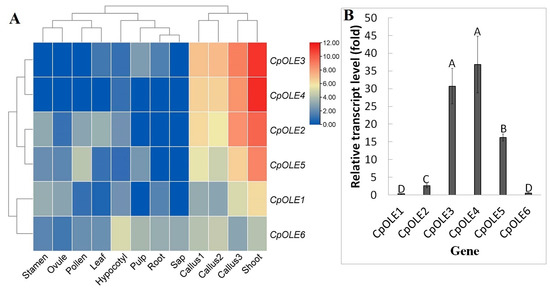 Expression profiles of CpOLE genes. (A) Tissue-specific expression profiles of CpOLE genes. Color scale represents FPKM normalized log2 transformed counts where blue indicates low expression and red indicates high expression. (B) CpOLE transcript abundance relative to the reference gene CpEIEF. Bars indicate SD (N ≥ 3) and uppercase letters indicate difference significance tested following Duncan’s one-way multiple-range post hoc ANOVA (p < 0.01). (Cp: C. papaya; FPKM: fragments per kilobase of exon per million fragments mapped; OLE: oleosin).